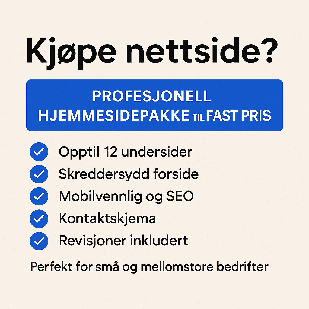 Vi tilbyr en komplett og profesjonell nettsidepakke – skreddersydd for små og mellomstore bedrifter som ønsker en moderne og synlig tilstedeværelse på nett.